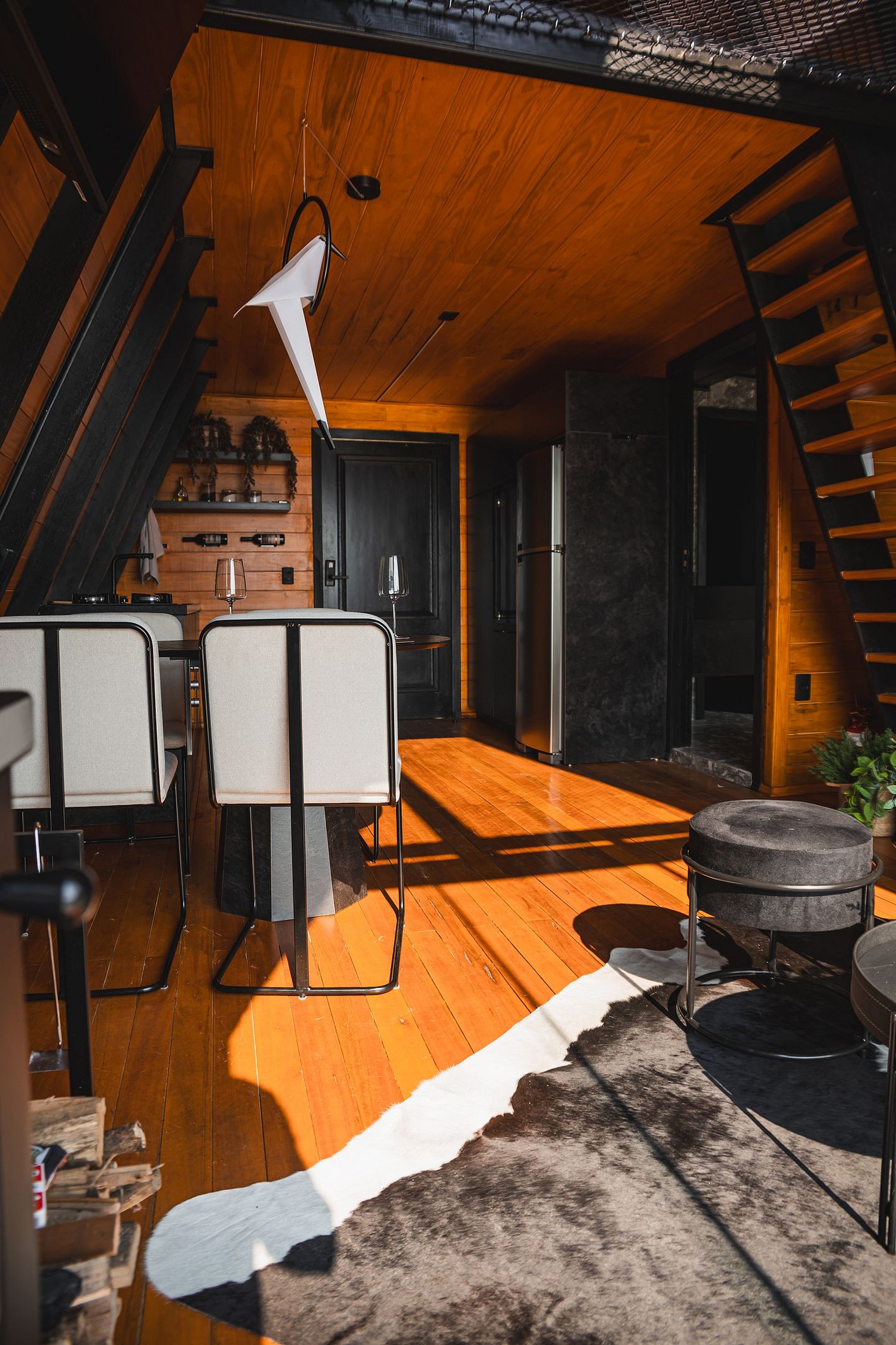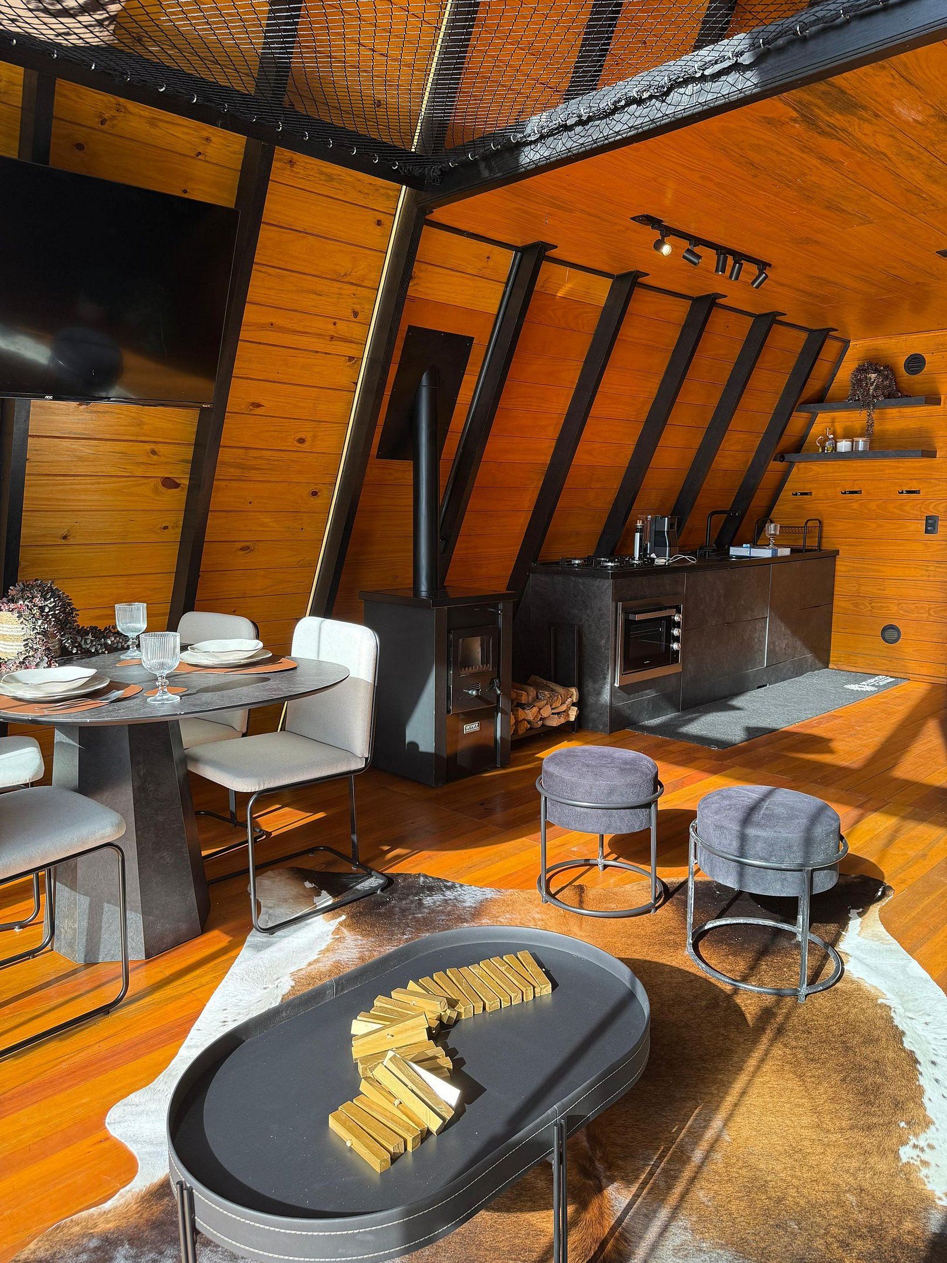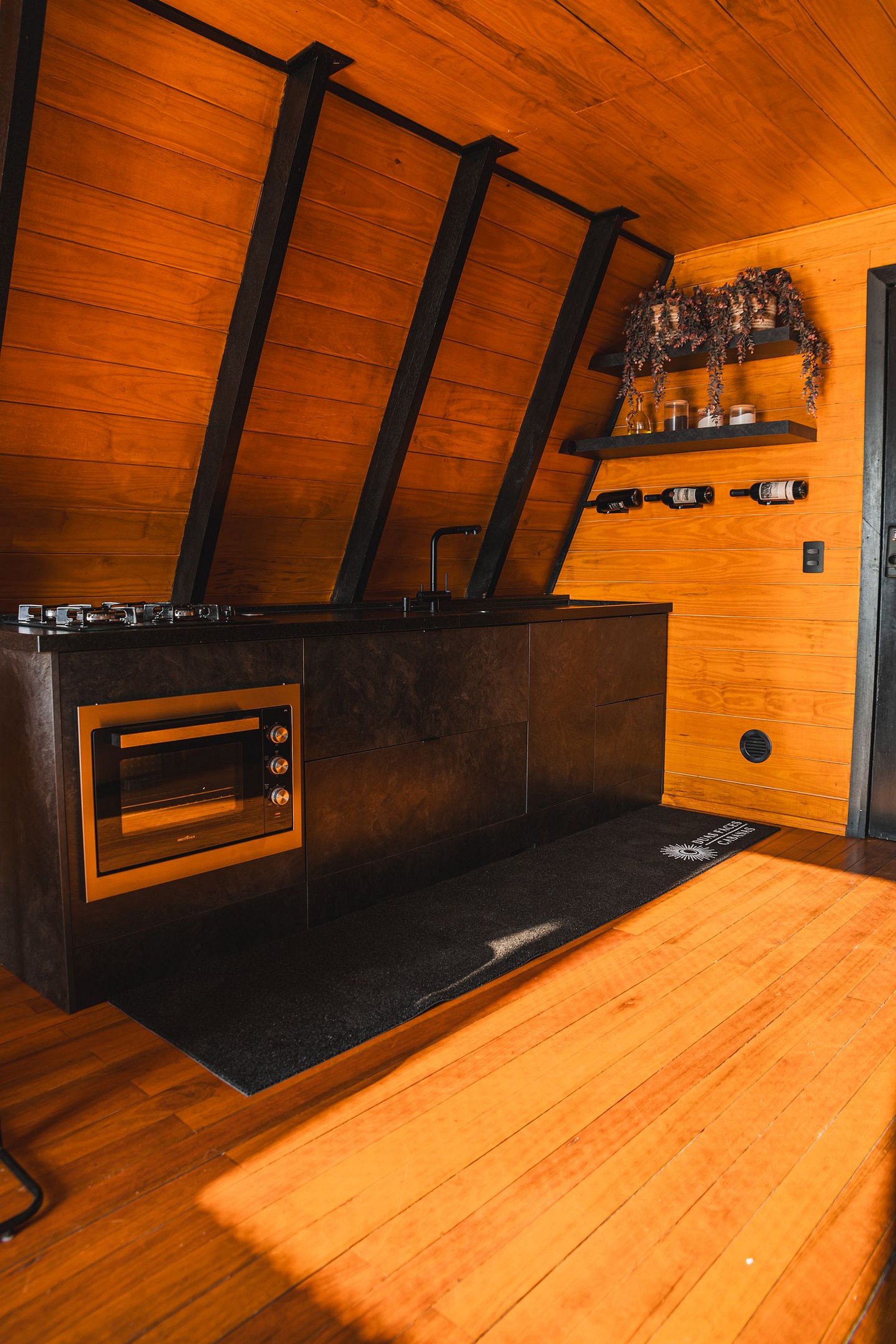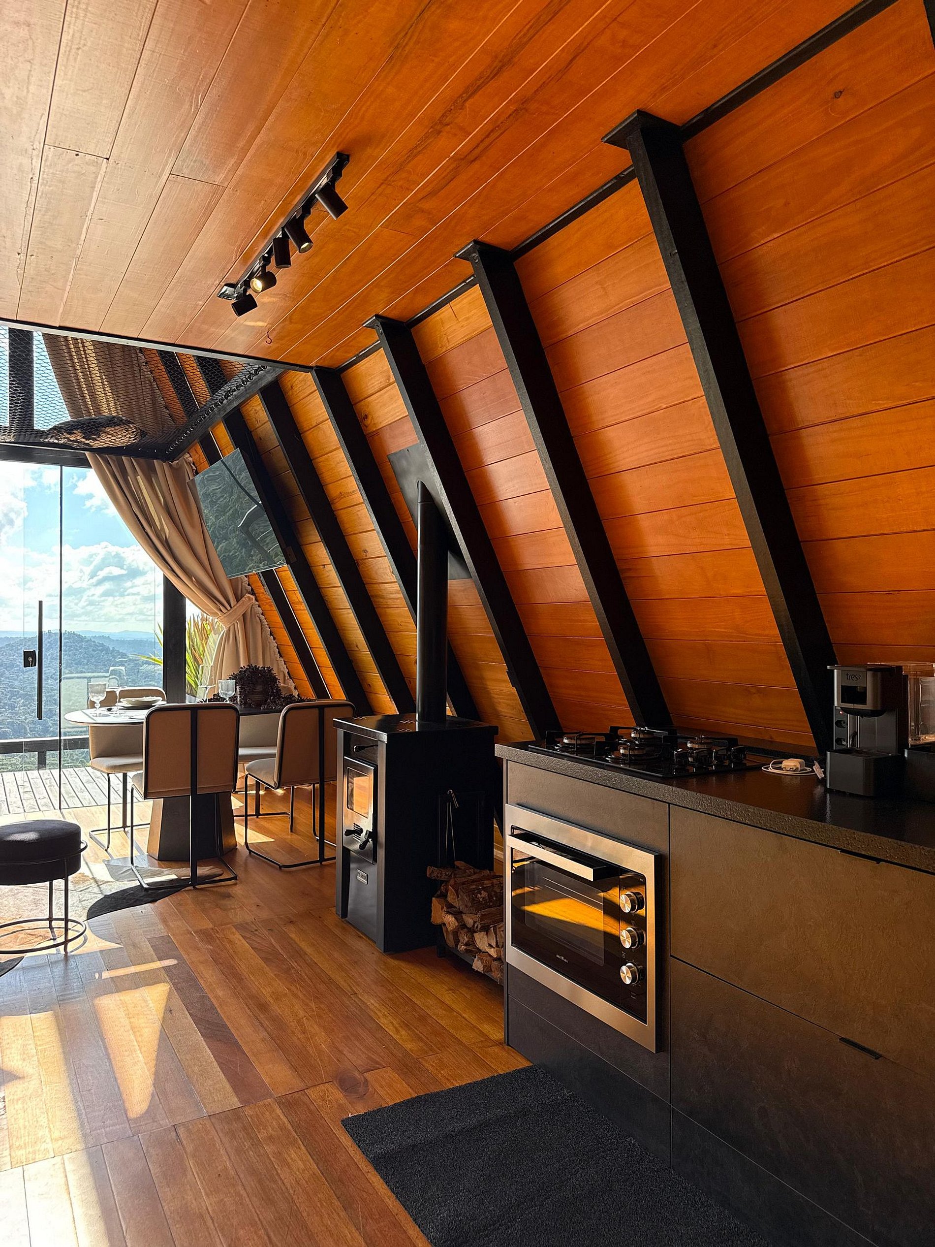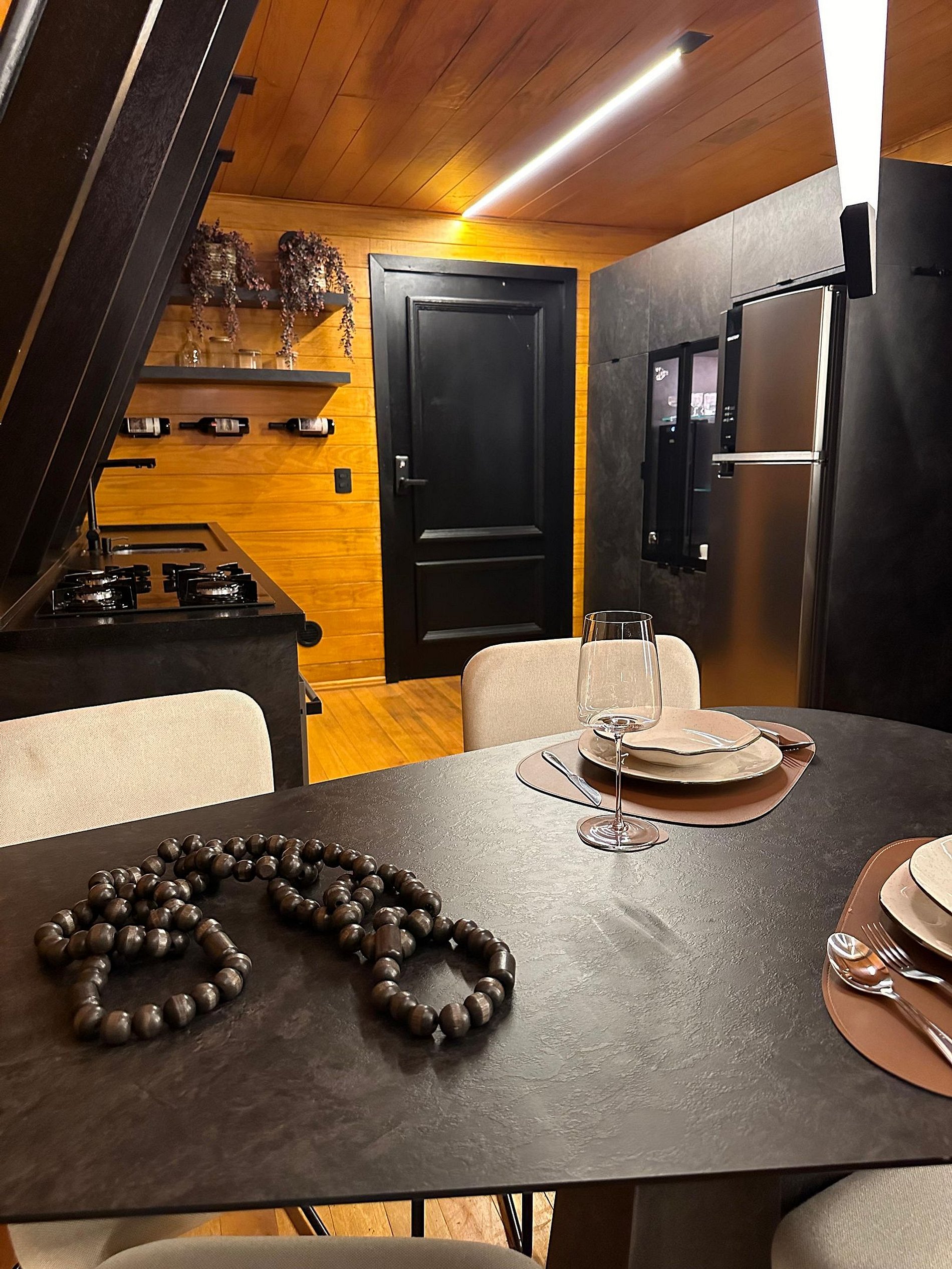 Aqui temos cozinha completa e equipada, adega, banheiro completo com chuveiro duplo à gás e banheira de imersão, sala com sofá cama, SmartTV 55”, lareira a Lenha, ar condicionado quente/frio e um deck maravilhoso com vista para o horizonte.