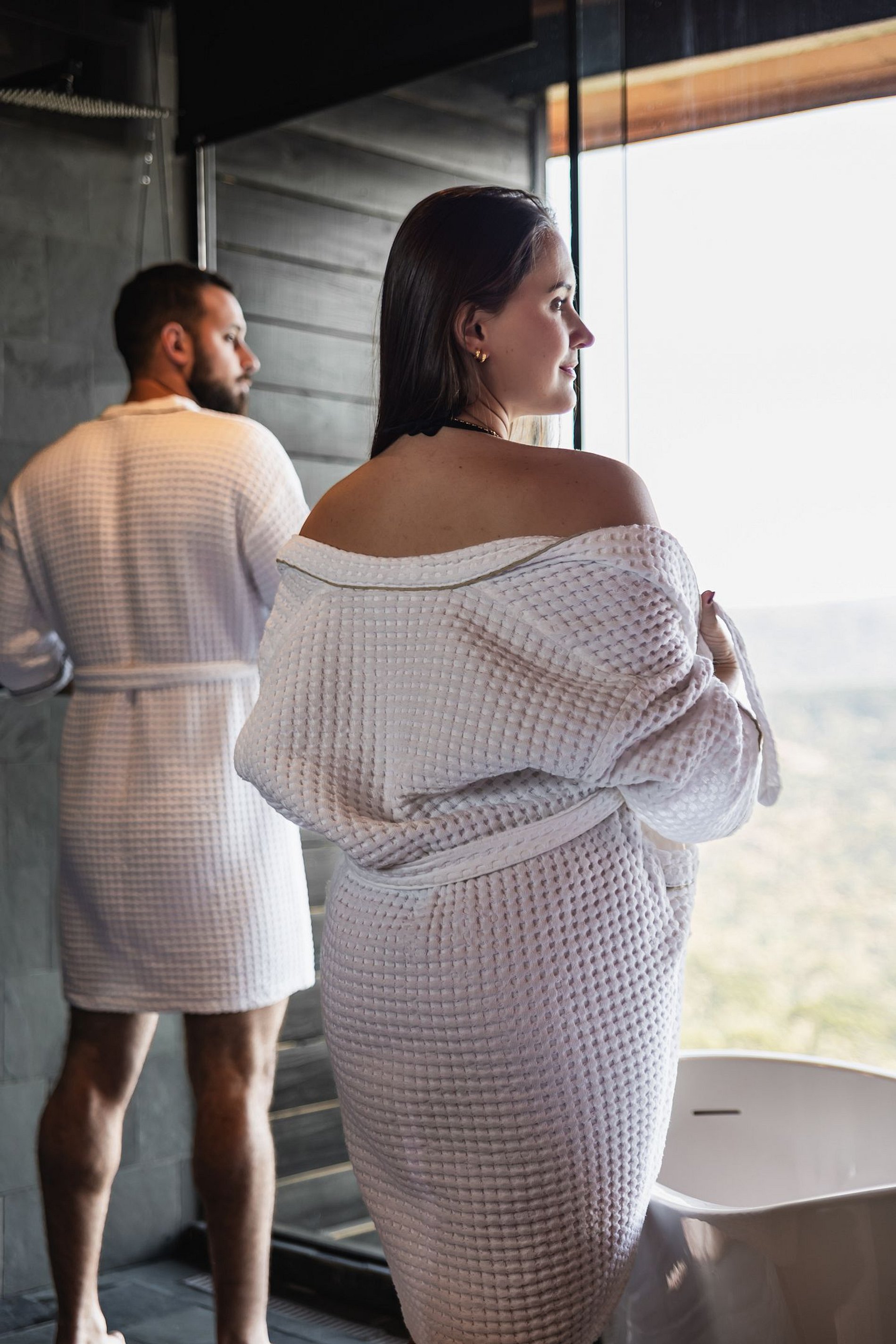 A cabana possui internet WiFi, cozinha 100% equipada com utensílios e eletros como forno, micro, frigobar, chaleira elétrica e outros eletro portáteis. A cabana conta com amenities como óleo, açúcar, sal, café, detergente e panos de louça na cozinha, lenha para calefator, além de toalhas de rosto, banho, roupões, mini shampoo, sabonete, papel higiênico e espuma para banheira.