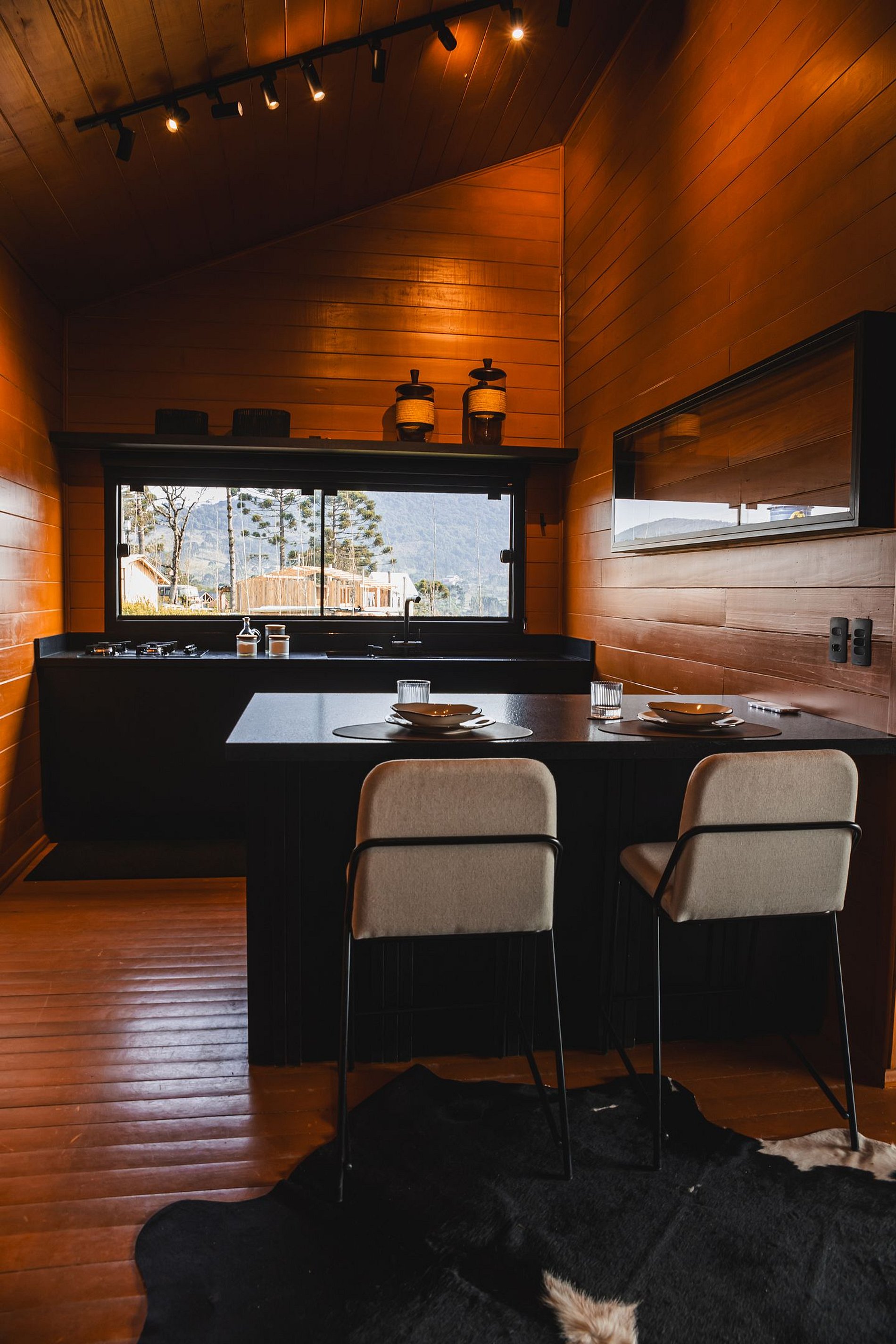 Aqui temos cozinha completa e equipada, adega, banheiro completo com chuveiro duplo à gás e banheira de imersão, sala com sofá cama, SmartTV 55”, lareira a Lenha, ar condicionado quente/frio e um deck maravilhoso com vista para o horizonte.