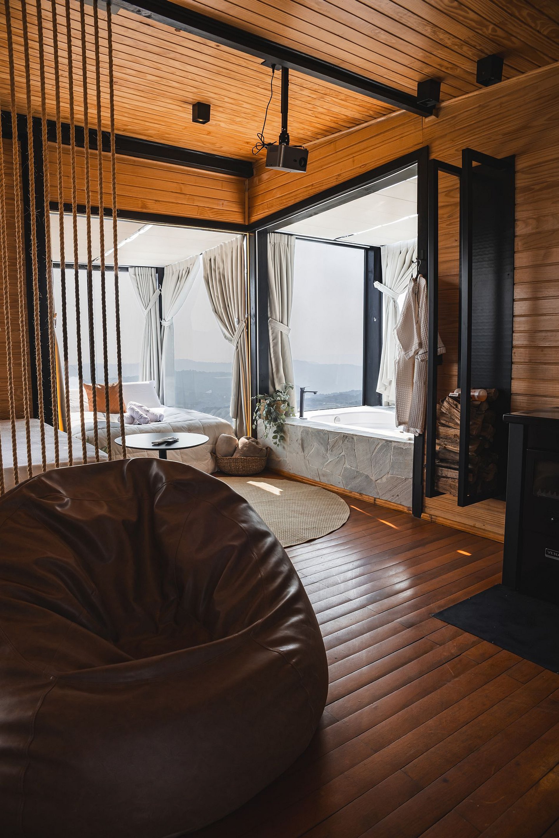 Aqui temos cozinha completa e equipada, adega, banheiro completo com chuveiro duplo à gás e banheira de imersão, sala com sofá cama, SmartTV 55”, lareira a Lenha, ar condicionado quente/frio e um deck maravilhoso com vista para o horizonte.